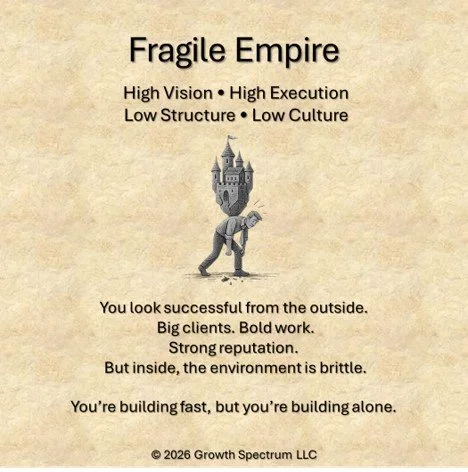 This is the organization that looks successful from the outside, fast growth, strong demand, impressive wins … but internally, everything feels one bad week away from collapse. You’ll hear things like: